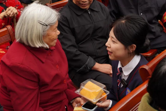 演出结束后,师生们将特意准备的定制版无糖暖心糕点逐一送到每一位老人手中。这份贴心的礼物,充分考虑到了老人们的健康需求,甜在口中,更暖在心里。