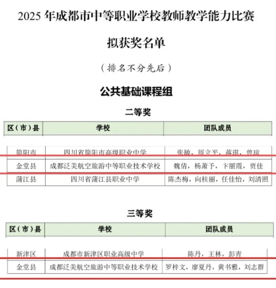 成都泛美航空旅游职业学校为贯彻落实《教育强国建设规划纲要(2024-2035年)》及国家职业教育高质量发展部署,深化“三教改革”,促进人工智能与教学融合,提升中职教师教学创新能力,由成都市教育局主办,市教科院、武侯区教育局承办,礼仪职业中学协办的2025年成都市中等职业学校教师教学能力比赛决赛及思政课程教学能力比赛于11月28日至30日顺利举行。我校教师在两个比赛中表现优异,共荣获一项二等奖和两项三等奖,展现出扎实的教学功底与持续的创新活力。