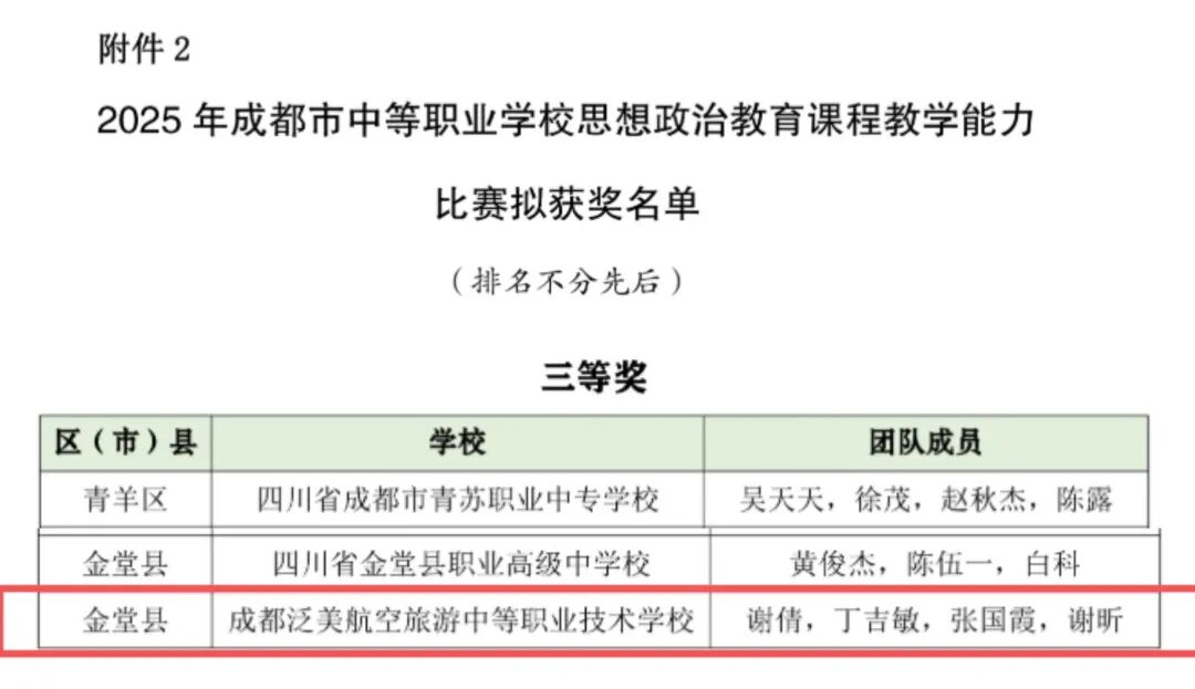 成都泛美航空旅游职业学校为贯彻落实《教育强国建设规划纲要(2024-2035年)》及国家职业教育高质量发展部署,深化“三教改革”,促进人工智能与教学融合,提升中职教师教学创新能力,由成都市教育局主办,市教科院、武侯区教育局承办,礼仪职业中学协办的2025年成都市中等职业学校教师教学能力比赛决赛及思政课程教学能力比赛于11月28日至30日顺利举行。我校教师在两个比赛中表现优异,共荣获一项二等奖和两项三等奖,展现出扎实的教学功底与持续的创新活力。