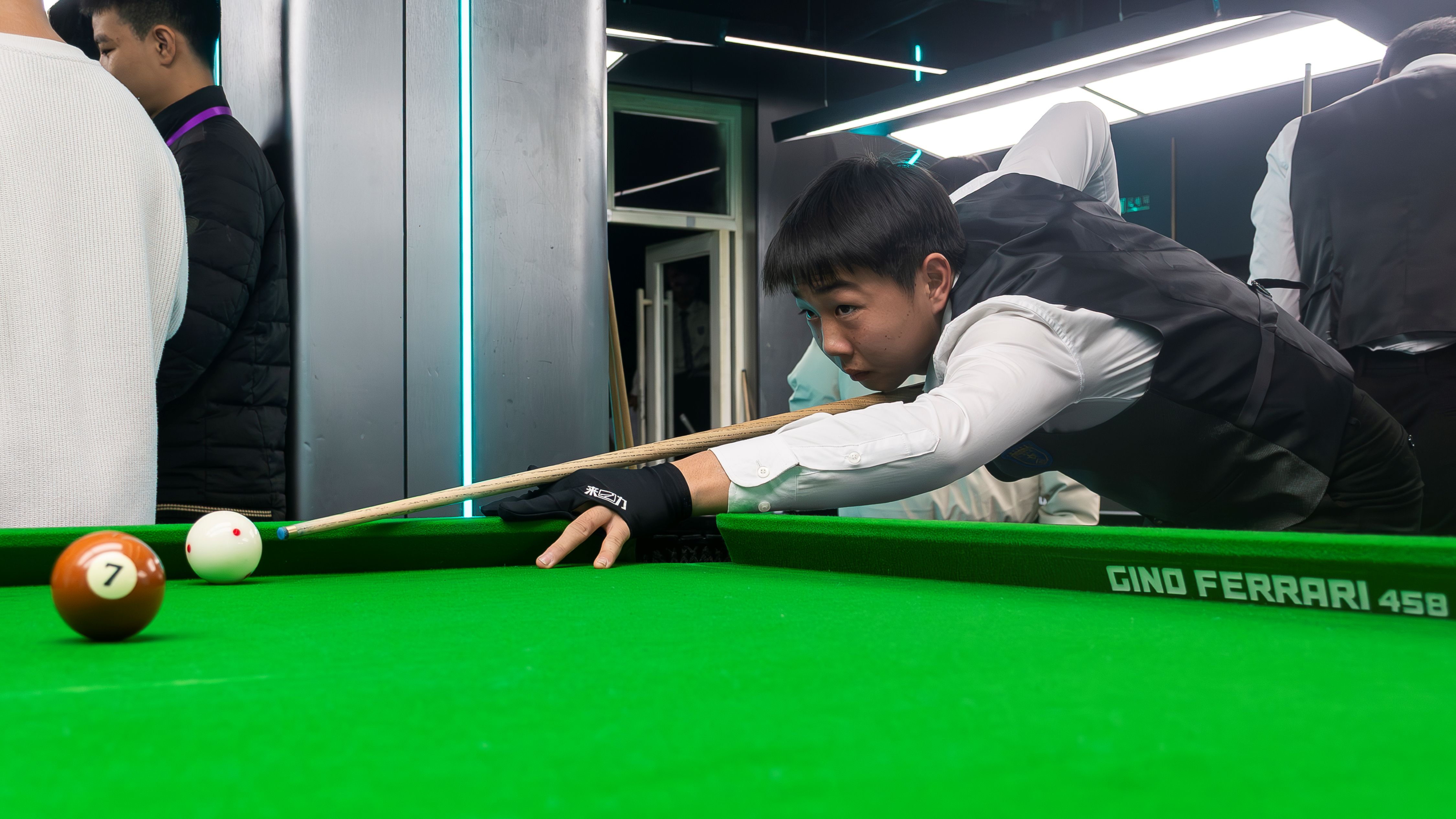 第二轮“团队接力赛”采用“蛇形分组法”,将第一轮积分排名第1、3、5、7...的选手与第2、4、6、8...的选手分为两队,确保实力均衡。比赛中,队员轮流上台击球,每人仅打一杆便需接力,两队在10分钟内比拼总进球数。即便技术稍弱的队员,也能凭借关键一球成为团队“英雄”,极强的协作感让现场紧张又热烈。