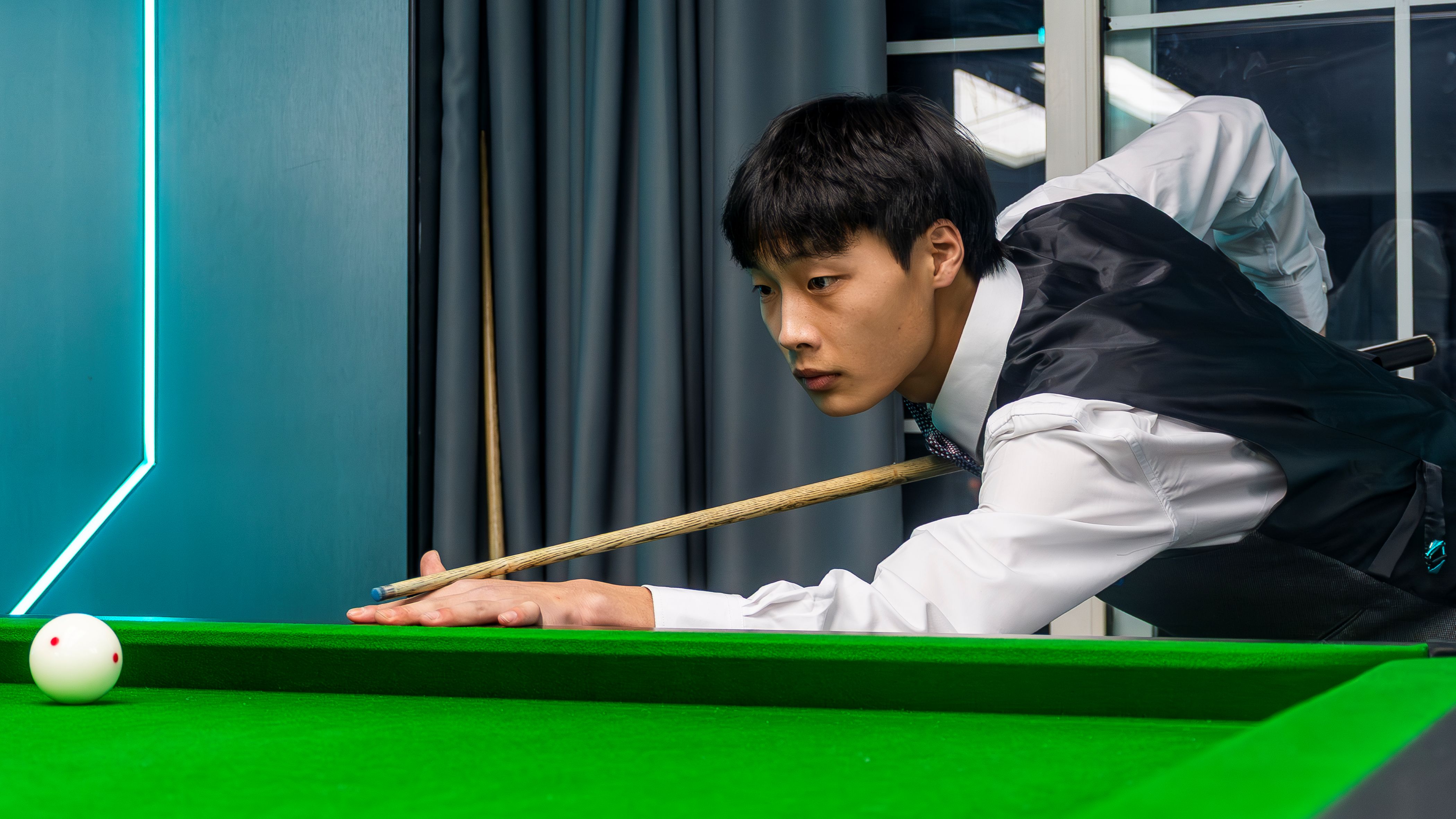 第一轮“趣味挑战赛”中,2-3个趣味项目同步开展,选手自由选择参与顺序累计积分。“全台混战”项目里,两名选手同台竞技,1-7号球散落台面,打进即得分,场面热闹非凡,运气与反应速度成为得分关键;“一杆清台挑战”中,选手从开球线出发,比拼一杆连续进球数,不少新手凭借“好运”打出高光时刻;“投票定球”项目则由观众指定目标球,考验选手在压力下的精准度,策略与技巧的碰撞引得现场欢呼不断。