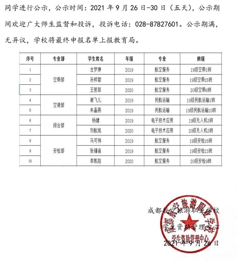 【公示】成航校拟申报2020-2021学年中等职业教育国家奖学金十名学生公示名单